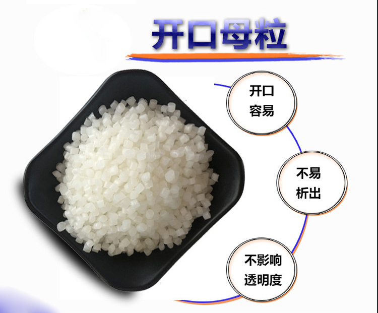 開口母粒是多種高效的專用助劑進(jìn)行復(fù)配,經(jīng)特殊工藝加工而成??捎糜诰巯N(PE、PP)塑料的加工,能有效地提高制品的開口(即抗粘連)性能及加工過(guò)程的潤(rùn)滑性能。